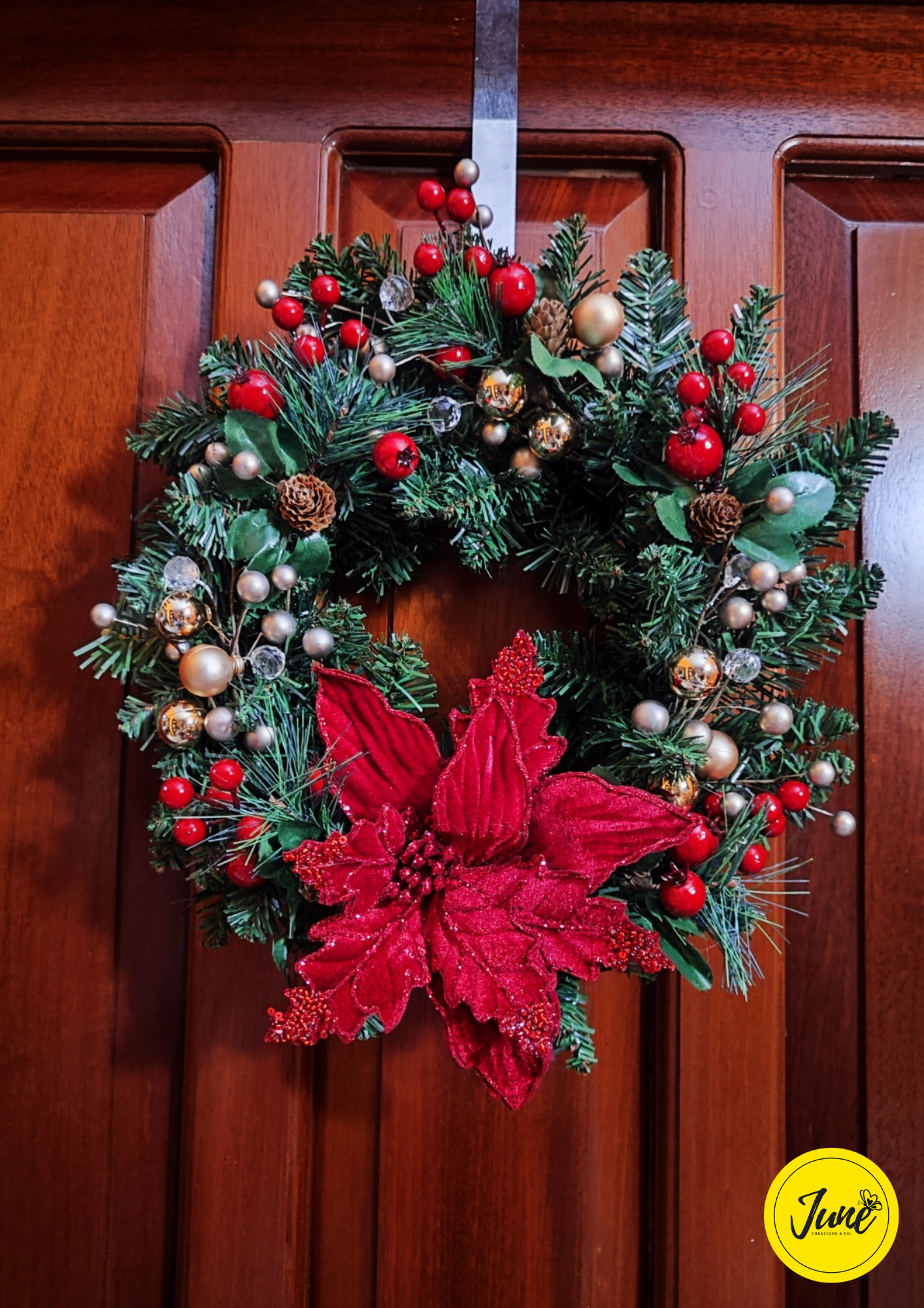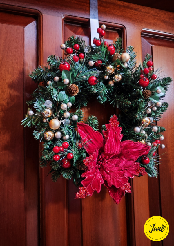 It consists of a 30cm wreath, a poinsetta, red berries and gold berries.